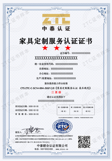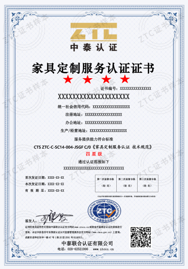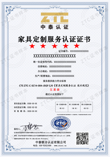 认证标准:CTS ZTC-C-SC14-004-JSGF C/0《家具定制服务认证 技术规范》