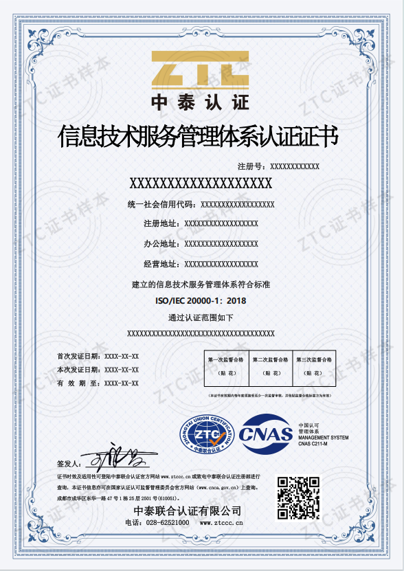 信息技术服务管理体系认证依据:ISO/IEC 20000-1:2018《信息技术服务管理第1部分:服务管理要求》上述标准更新时,使用更新版本。